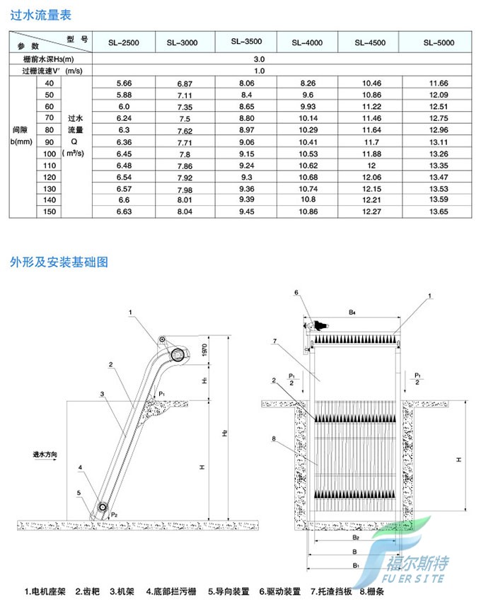 6、底部設(shè)置副格柵,當齒耙從主格柵的背后轉(zhuǎn)到前側(cè)后,副格柵自動與主格柵貼合,防止水流的短路而流入漂浮雜物。